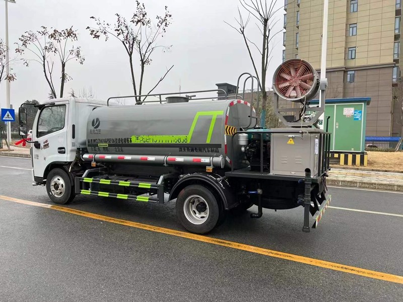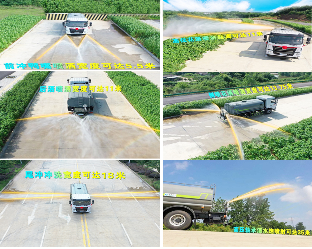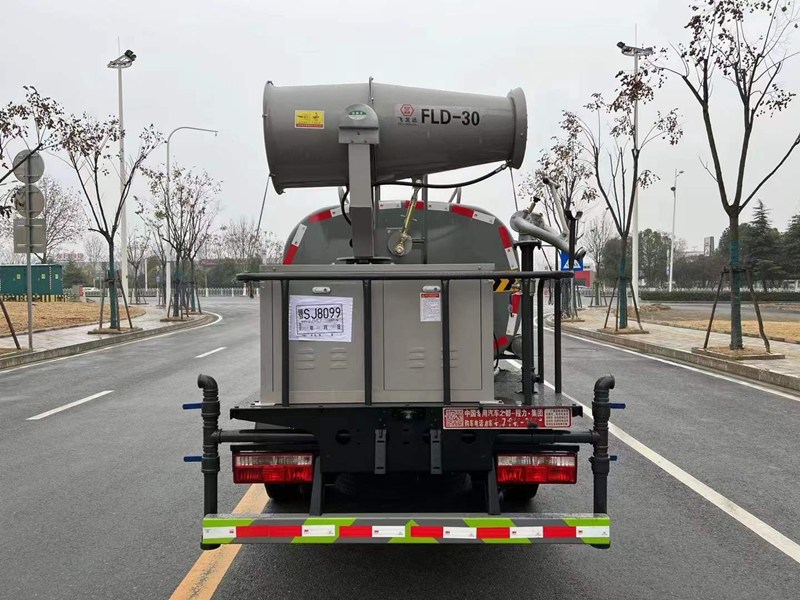 5噸霧炮灑水車專用功能配置:罐體實際容積約為5立方米,采用武鋼優質碳鋼板卷壓成型,自動焊接。配備專用灑水泵,自吸自排,前噴后灑、側噴、后工作平臺及灑水高壓炮。灑水泵自吸高度為6米左右,整車灑水寬度14米左右,后工作平臺高壓水槍上下左右360°旋轉可調成:直沖狀、大雨、中雨、小雨、有效射程≥28米,可整車帶接頭、水位計,自流閥。后工作平臺主管道有一個一寸的澆花接口,附送2根3米水管,1個爬梯,兩側及后保險杠。