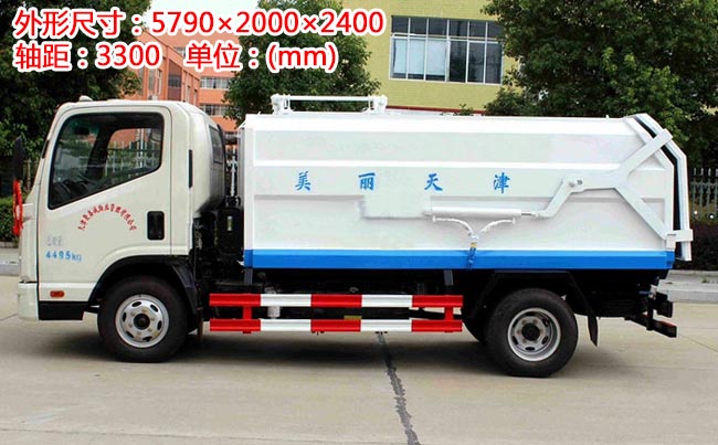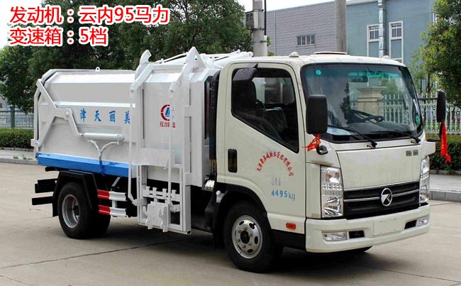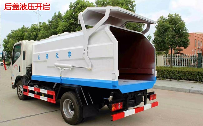 箱體容積5~6立方米,外形與掛桶垃圾車相似,箱體材料邊三底四碳鋼,內部做防銹處理,側方帶掛桶提升機構,車尾部橡膠密封條,內置推板,后蓋液壓開啟。