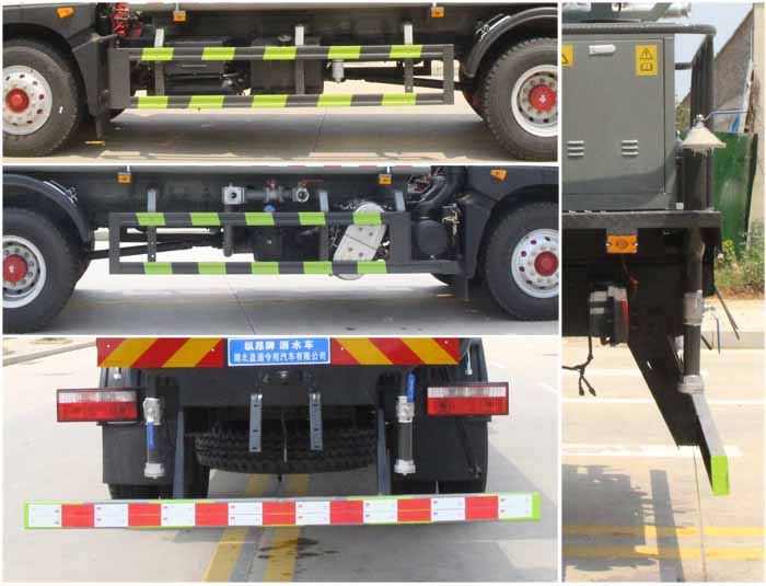 東風15噸灑水車產品標配前噴(鴨嘴)、后沖、后灑、側噴、后置式工作 平臺,平臺上配置綠化水炮(可 360°旋轉,既可以調成柱狀,也可 以調成霧狀,更可以調成直沖狀、大雨、中雨、小雨、毛毛雨),配 備優質大功率專用灑水泵(可自吸自排,可從河里或池塘抽水到罐體), 取力器,雜物過濾網,消防接口,自流球閥系統、取力器、球閥、濾網 均為國家標準產品