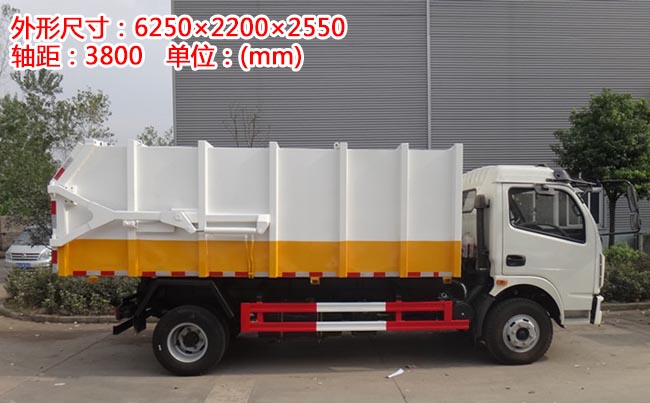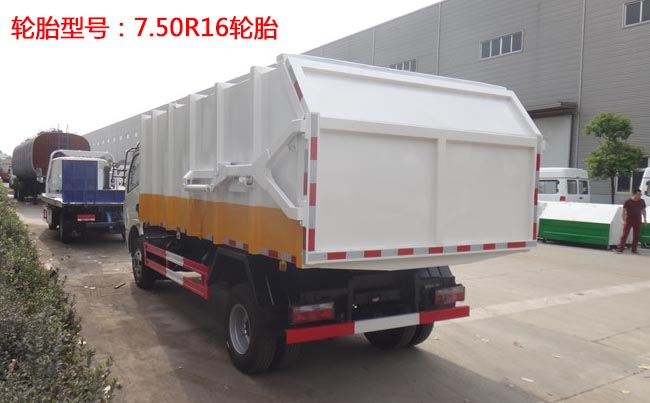 容積7~8立方米,方形密封式箱體,材質(zhì)邊三底四,國(guó)產(chǎn)油泵、多路閥、取力器、液壓油缸,駕駛室外部操作,箱體底部雙杠液壓舉升卸料,箱體后門(mén)液壓開(kāi)啟。
