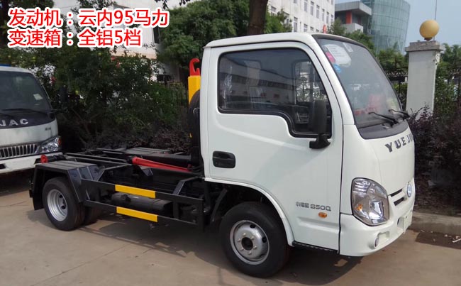 躍進(jìn)小福星勾臂式垃圾車,上汽躍進(jìn)底盤,云內(nèi)德威95馬力,柴油發(fā)動(dòng)機(jī),全鋁5檔變速箱,軸距2.8米,輪胎型號(hào)185R14重型后雙胎,前盤制動(dòng)。