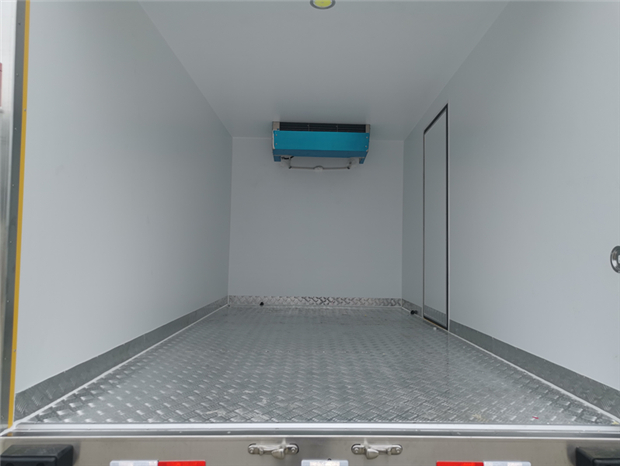 江鈴順達4米2冷藏車廂體配置為:采用斷橋隔熱工藝,整體框架結構制作,廂體內、外壁材料為玻璃鋼板,采用高密度保溫層,廂板內帶有骨架,廂體厚度80mm,門框,門飾件、包角全部使用不銹鋼材質。最新款鋁合金包邊型材,廂體內采用LED照明燈及廂體示寬燈;門框密封條為橡膠材質,后門梁帶加厚防撞塊,加厚型不銹鋼鉸鏈及鎖件。車體副梁采用510L高強度鋼制作,底板為鋁花紋板,車廂后門帶一個上車扶手,其余標配;
