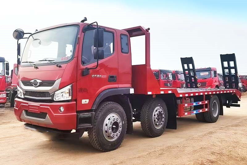 福田前四后四平板拖車,國六排放標準,采用新款瑞沃ES5駕駛室,標配中控鎖電動門窗、原廠空調、氣囊座椅、定速巡航、ABS等,可定制液壓雙節折疊爬梯,爬梯長度4米以上,運輸叉車等機械設備