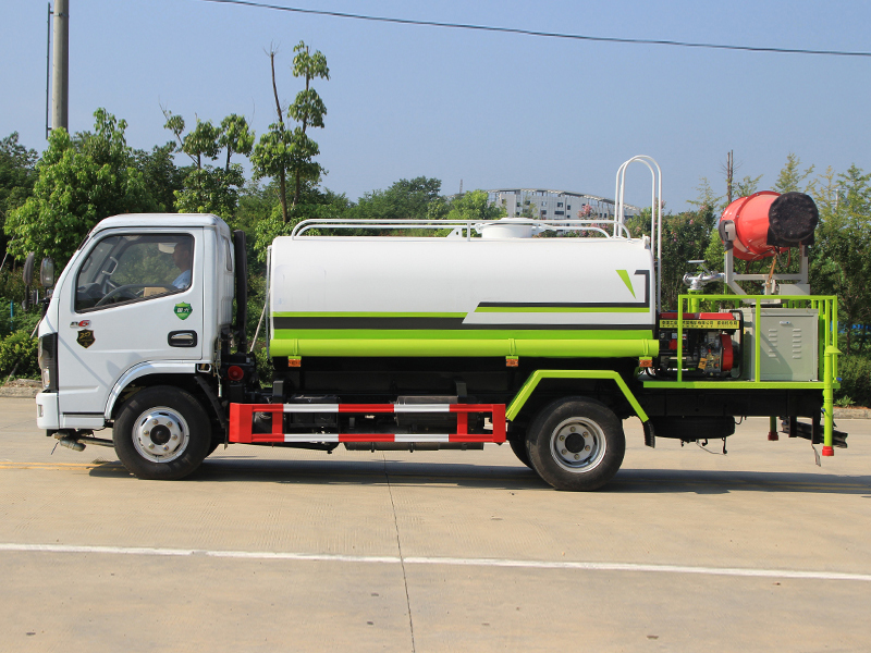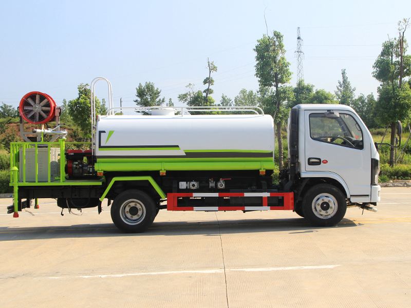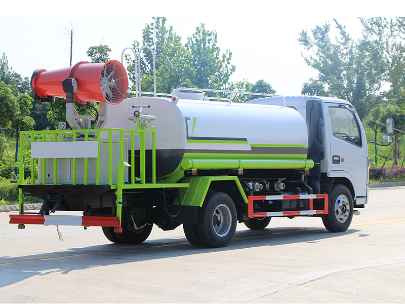 上裝配置:罐體容積5立方,前(噴)后灑,帶側噴,罐體后帶工作平臺,平臺上安裝綠化灑水炮,灑水炮可全方位旋轉,可連續調成直沖狀、大雨、小雨、毛毛雨,帶安全護欄,配大功率專用灑水泵,泵可自吸自排,安裝過濾網,帶消防接口,可通過消防栓進水,帶自流閥。選裝30-50米射程霧炮。