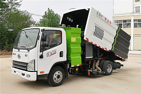 6.垃圾箱容積4m3,水箱1m3內部加裝進口防水材料濾筒,垃圾分類存放,能有效地對樹葉,石子,灰塵進行粗細處理,廂體采用傾翻卸料。